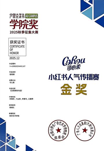 其中,南京艺术学院传媒学院 22 级广播电视编导专业学生仲雨珩、卞丛笑、李蒙均、王嘉荣创作的可心柔命题短视频作品《太阳照常升起》,凭借流畅的叙事节奏、丰富的镜头语言、绝佳的品牌契合度,在今年送选的共二十余万件作品中,获得组委会、企业的一众认可,并在获奖作品中历经层层筛选,脱颖而出,成功入围全场大奖最终评审环节,与来自全国不同高校的另外五支优秀团队同台进行提案比拼,共同角逐赛事最高荣誉。